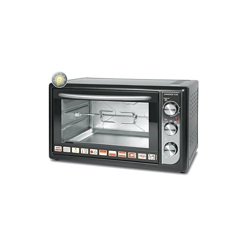 Equipado com 2 resistências blindadas em aço, luz interna, temporizador de 60 minutos, com bloco e termostato regulável até um máximo de 230 ° C, o X50 está equipado com 5 funções de confecção, com possibilidade de regulação apenas do grelhador, ideal para grelhar carnes e peixes na perfeição, enquanto a ventilação interna permite um cozimento uniforme em pouco tempo.